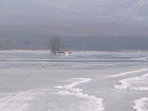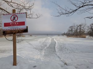 (※湖なのでまさかではありません。氷はまだしっかり張って歩けますが溶けてる箇所があり危険なので立入禁止ですネ)